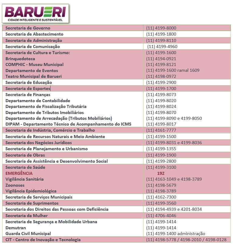 - LEGISLATIVO: A Câmara Municipal de Barueri está localizada na Rua WAGIH SALLES NEMER, nº 200 (Ao lado do Senai). O telefone é 4199 7900. O horário de funcionamento é das 8h00 às 17h00 ou mais informações através do site https://www.barueri.sp.leg.br/